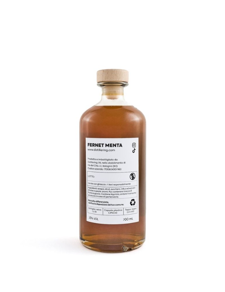 Fernet Menta di Distillering unisce la base amara del Fernet con fresche note di mentuccia ed eucalipto. Perfetto con ghiaccio o nei cocktail per un tocco aromatico.